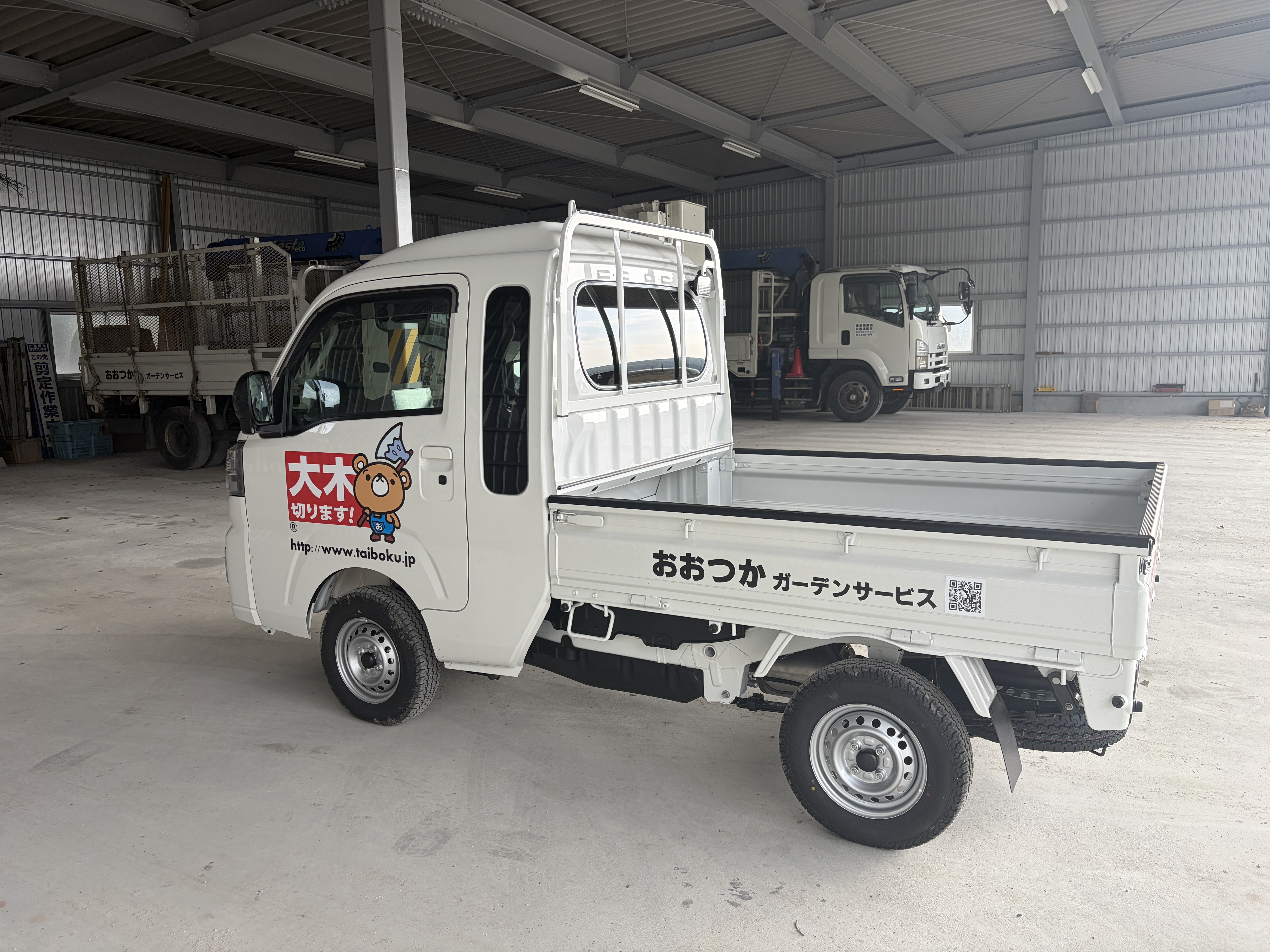 早速ラッピングをして「大木切ります!」仕様の軽トラになりました!