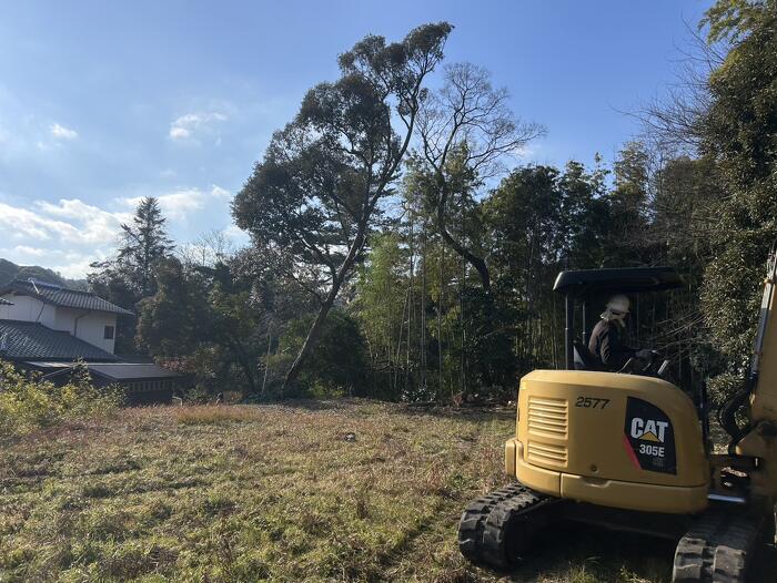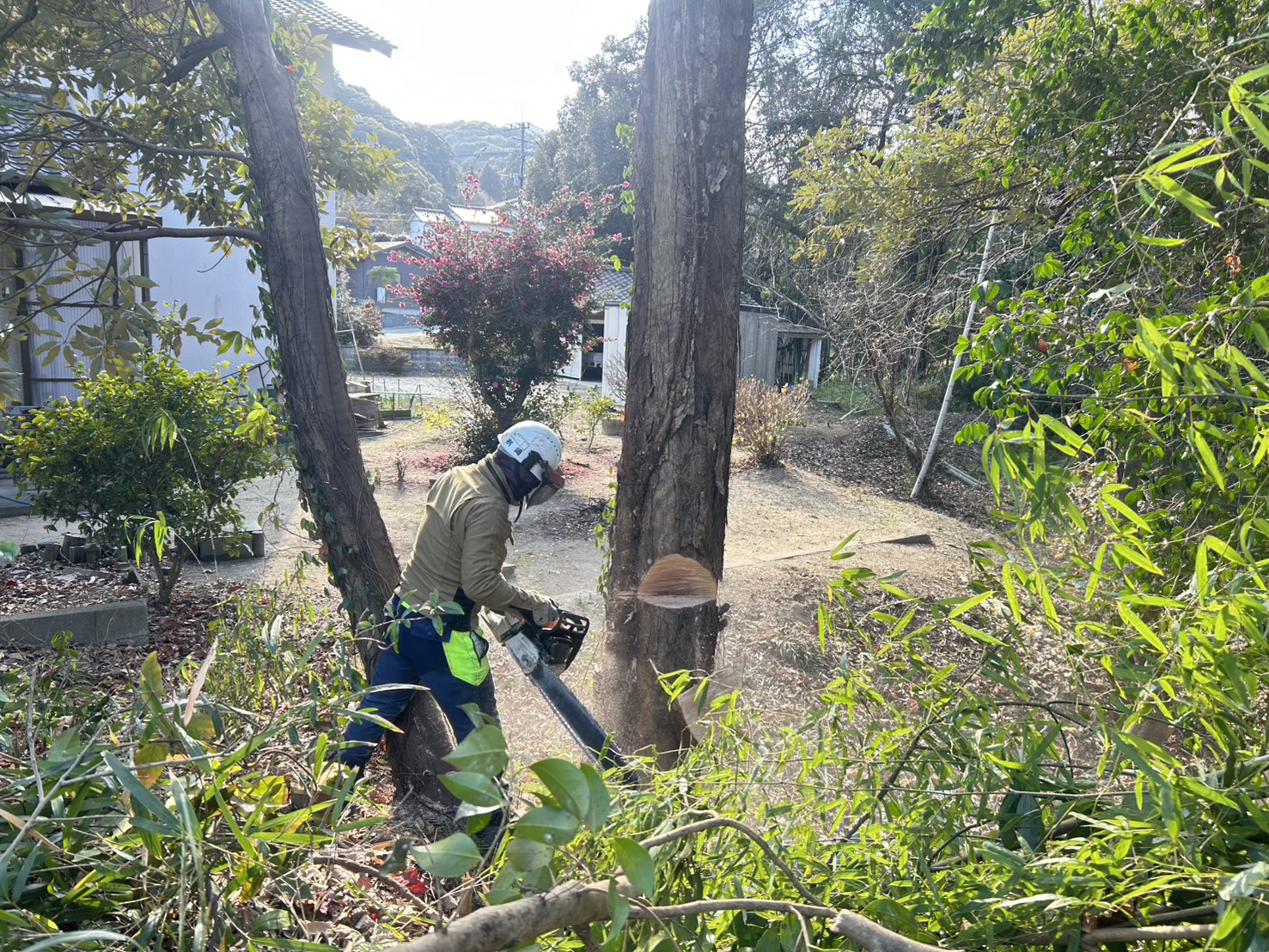 福岡県のお客様から所有地の木が隣接の住宅に落ち葉などで迷惑をかけているということで根元から木を伐採したいとのご依頼でした。