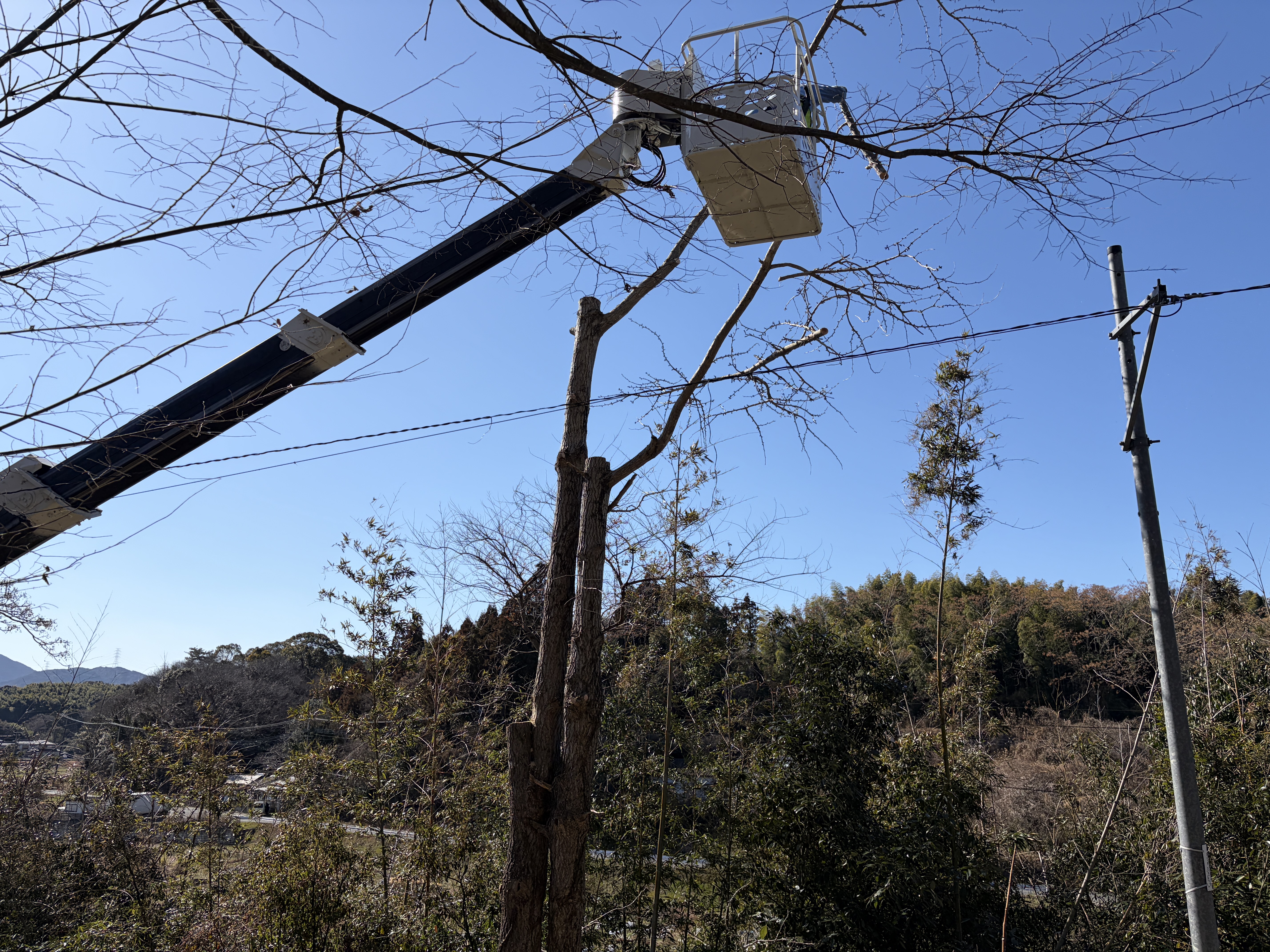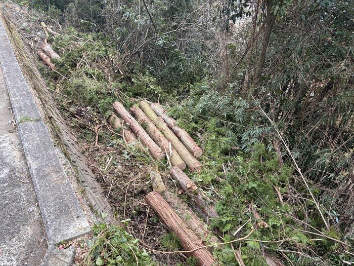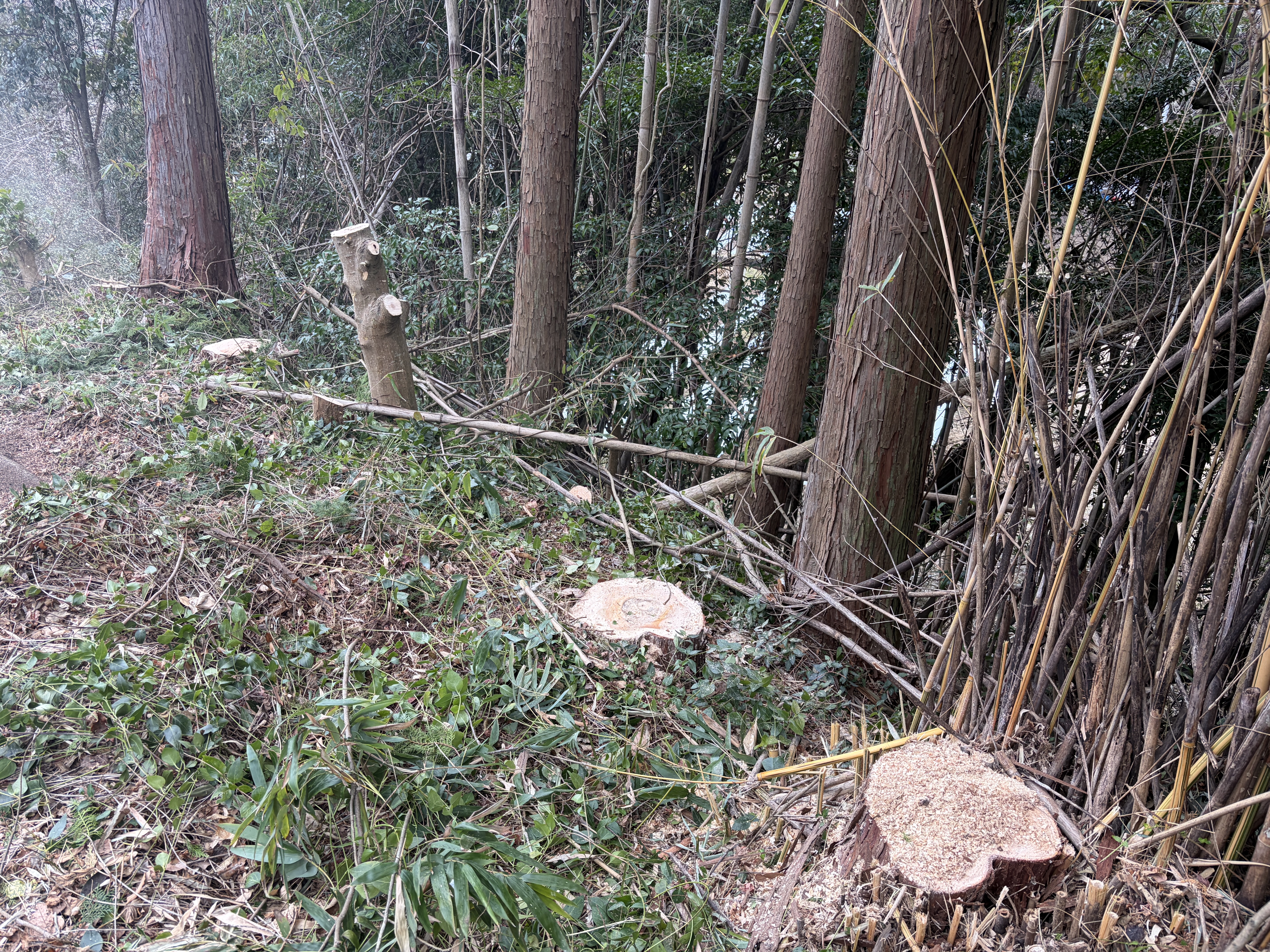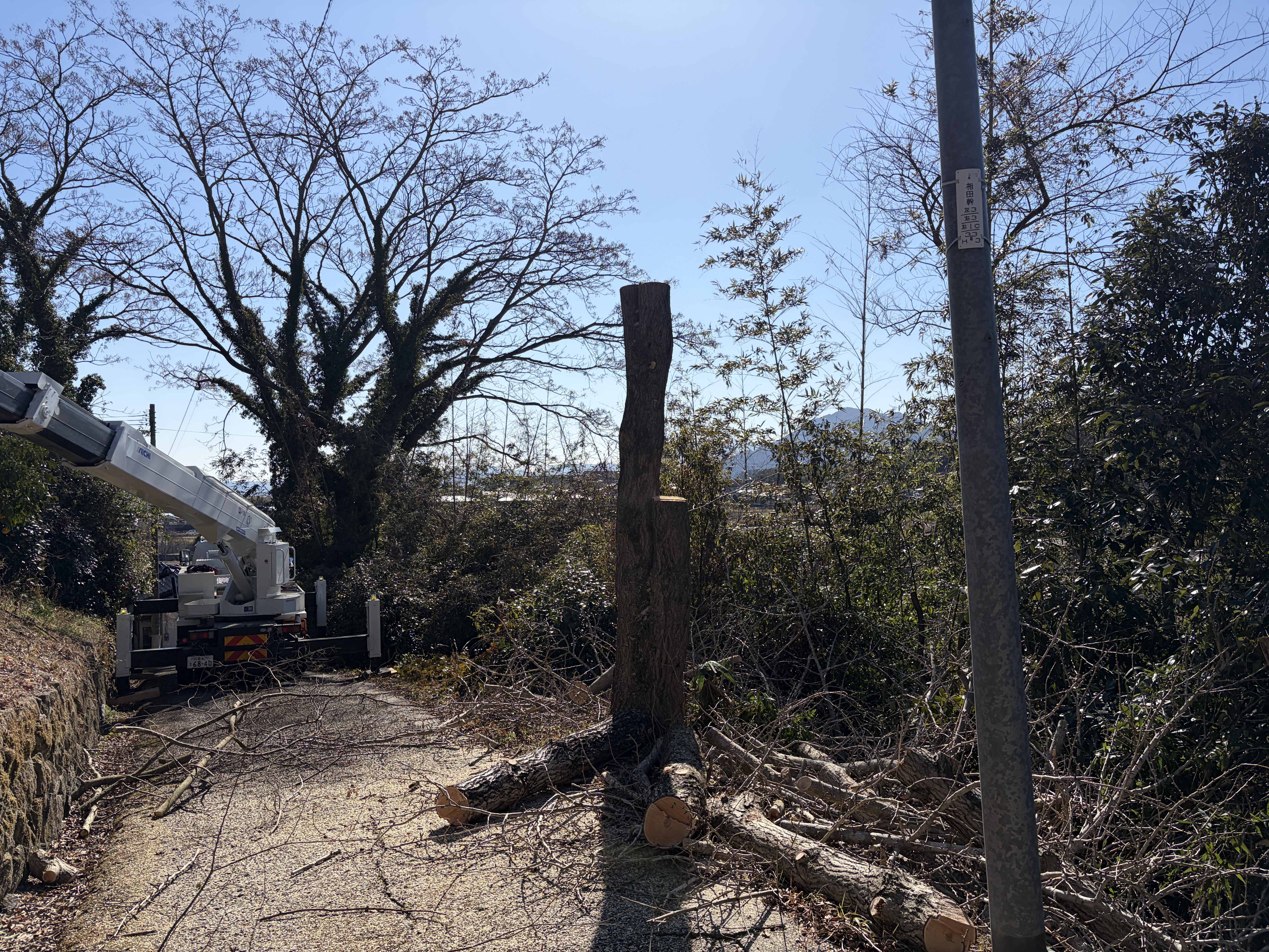 住宅側の枝を切ってほしいとのことでしたが、そのうち3本が枝を切ると枯れてしまう可能性があるため、急遽根元から切るかたちとなりました。