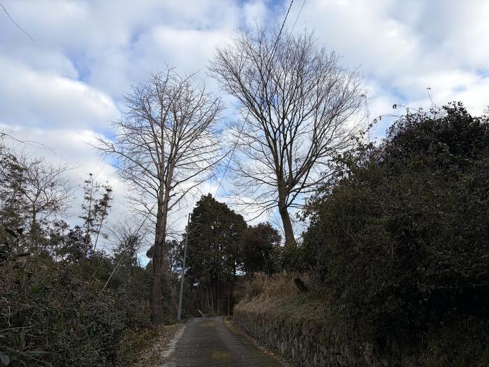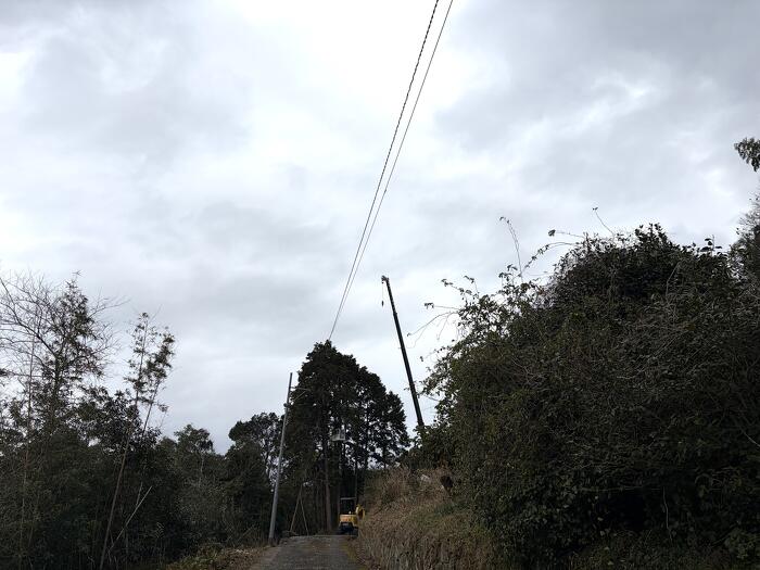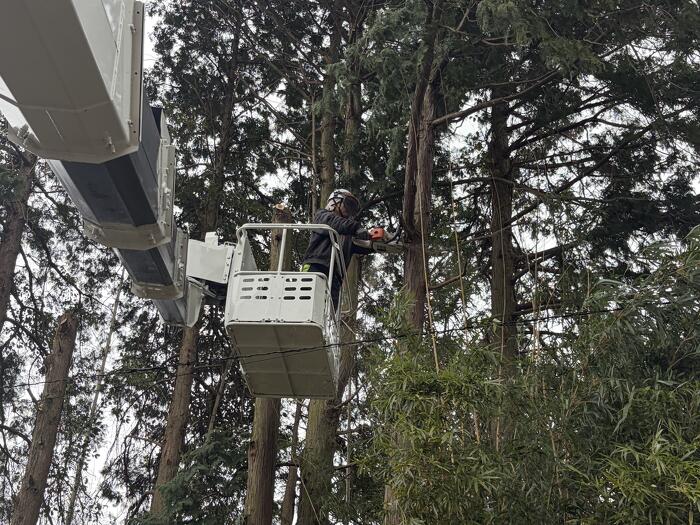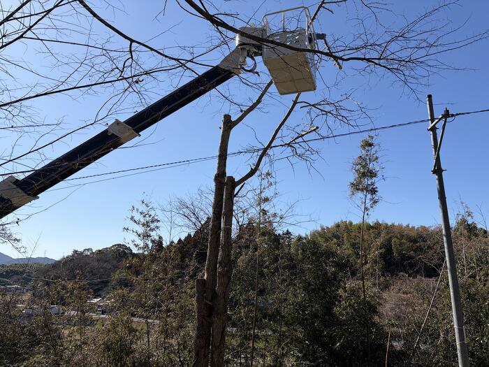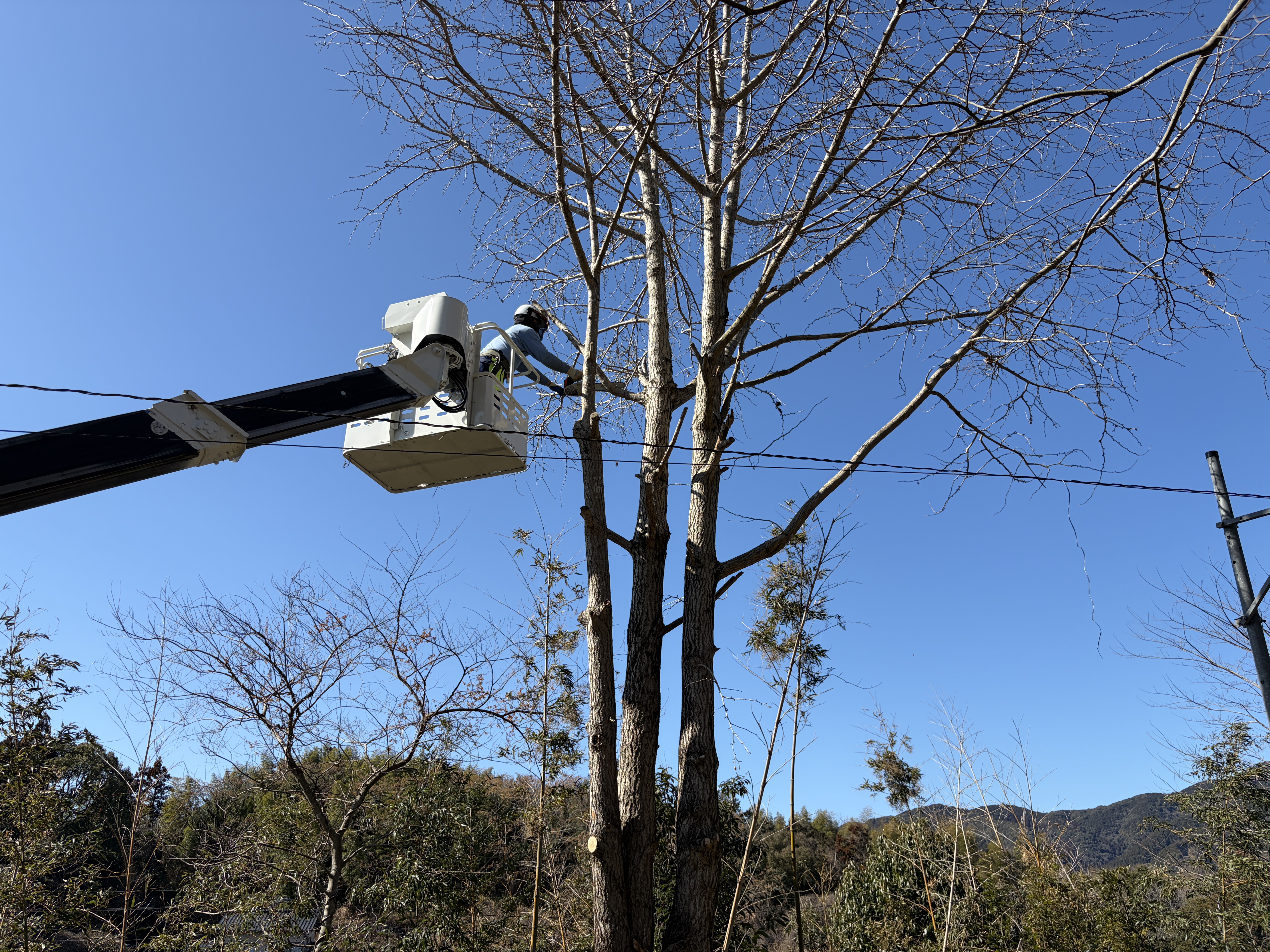 自宅前の道にあるケヤキ2本を高所作業車を使用して伐採していきます。