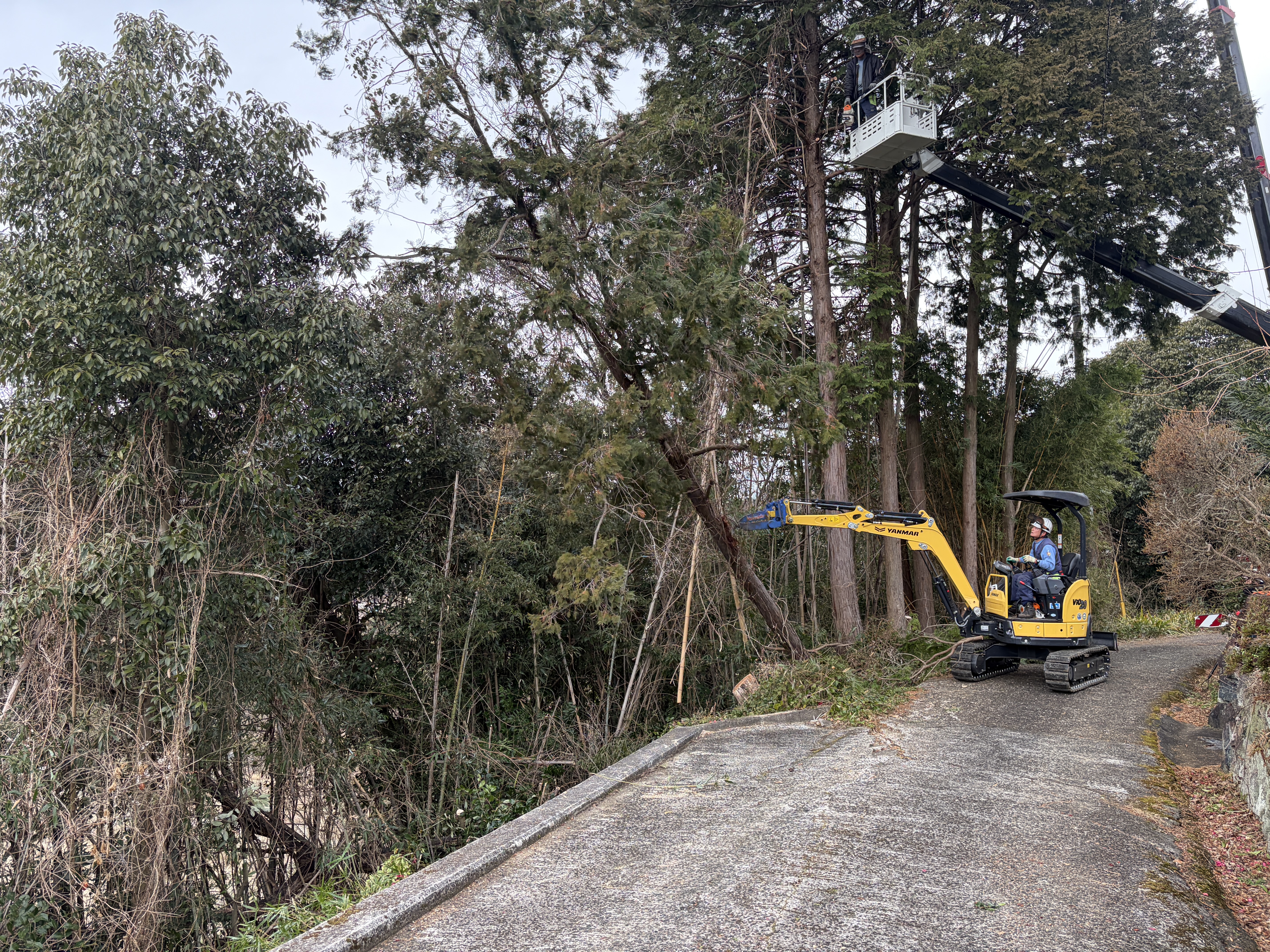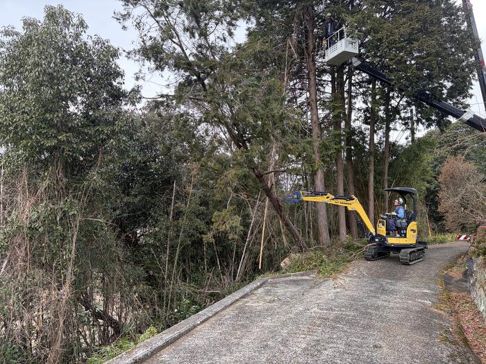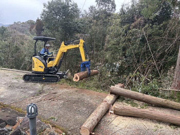 クレーンを使用して枝を落とし、根元切りは職人が倒す方向を慎重に調整してバックホウで押して倒します。
