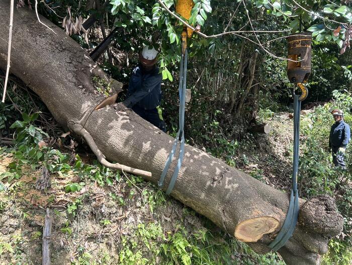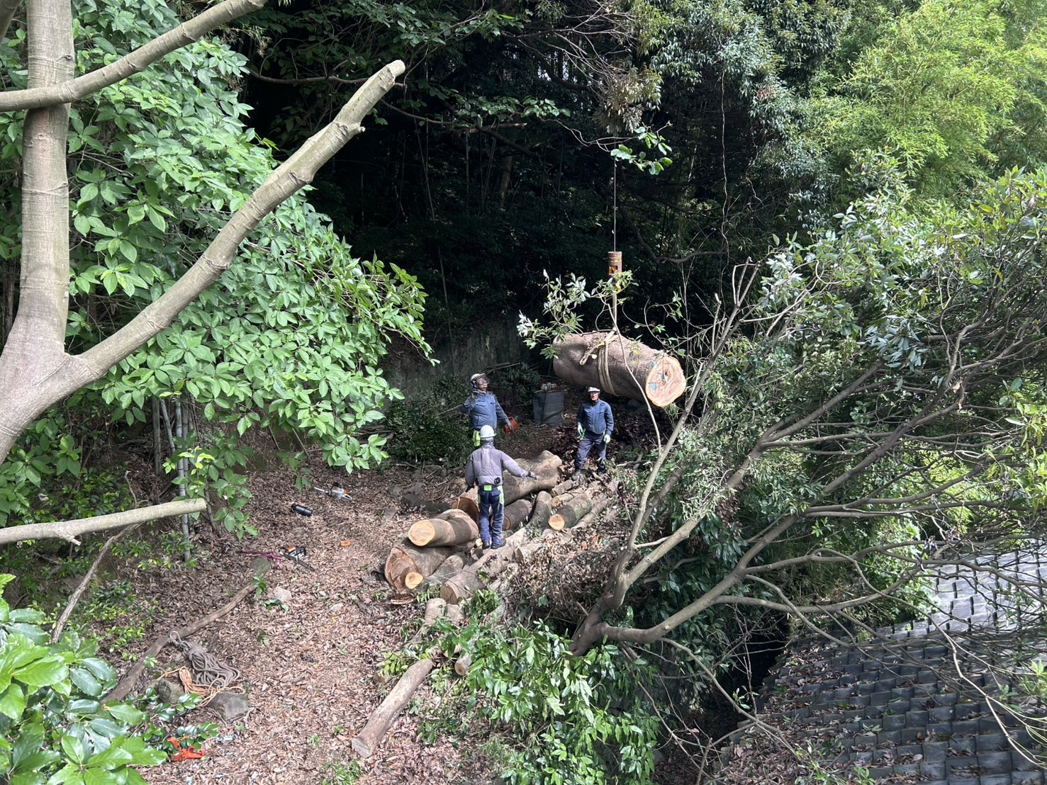 伐採した木は敷地内の安全な場所に現場置とさせていただきました。