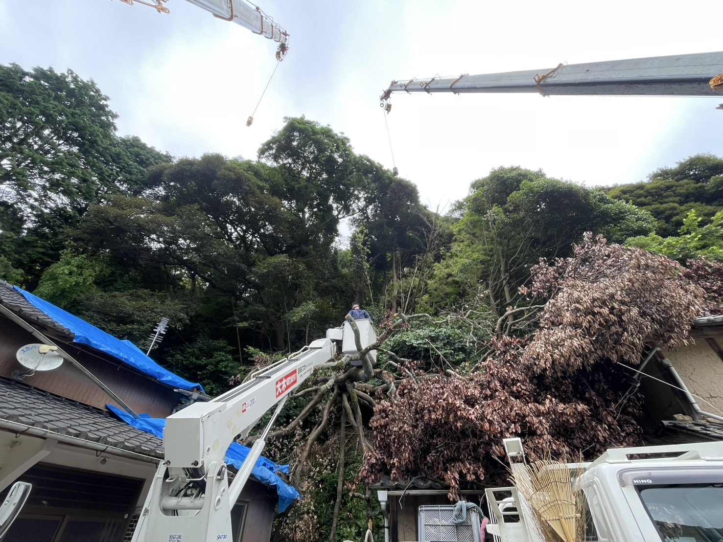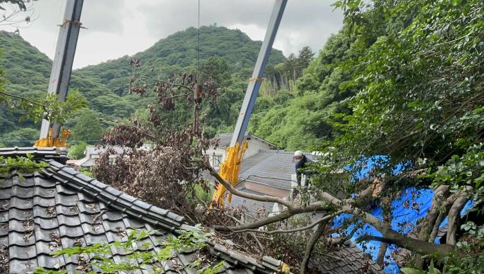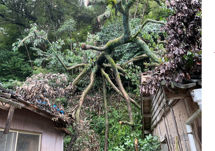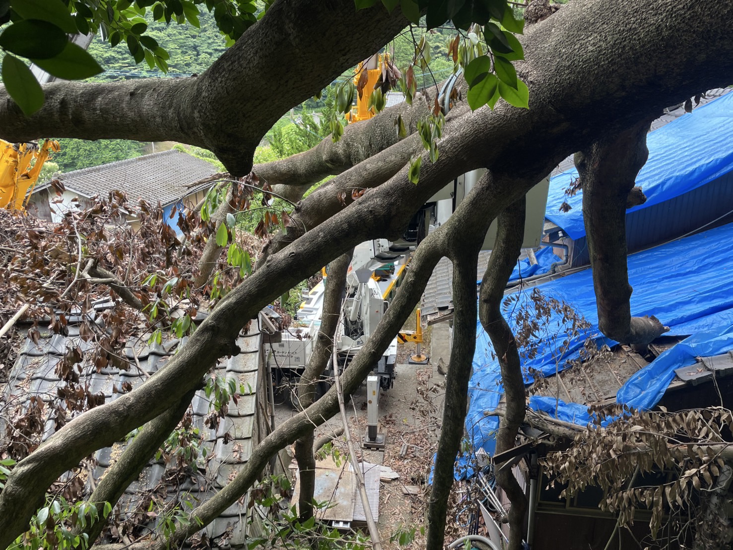 大分県内のお客様より、強風で自宅の上に木が倒れたということでご依頼いただきました。