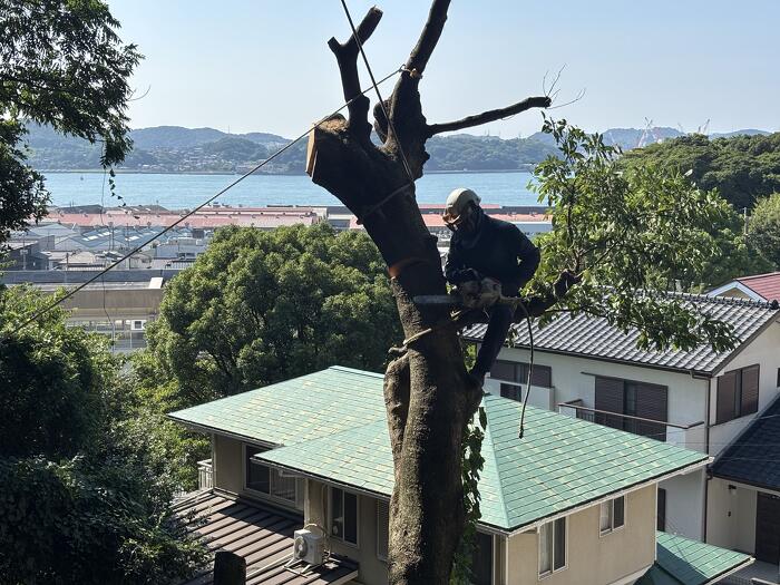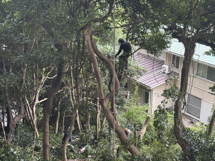 クレーンや高所作業車が一切入れない場所となりますので、全て手作業での伐採となります。職人がロープを使用して枝や幹を落としていきます。