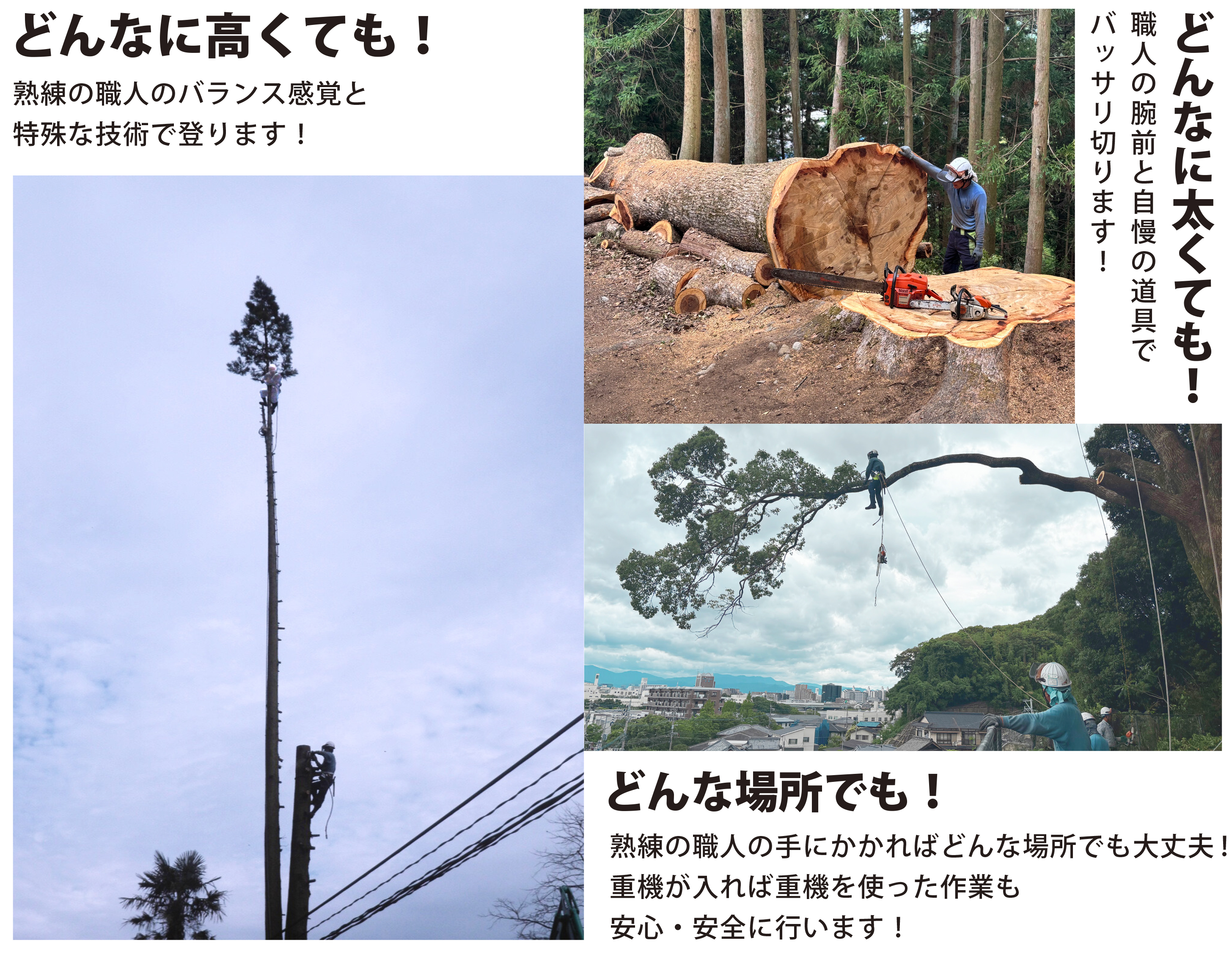 「空師」として大木を切って40年の当社は、重機が入らない場所や、住宅地に囲われた場所の大木でも熟練の職人の身一つで登り、ロープなどを使い安全に伐採・処理していきます。