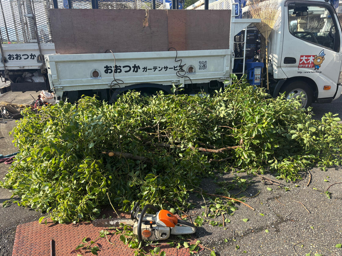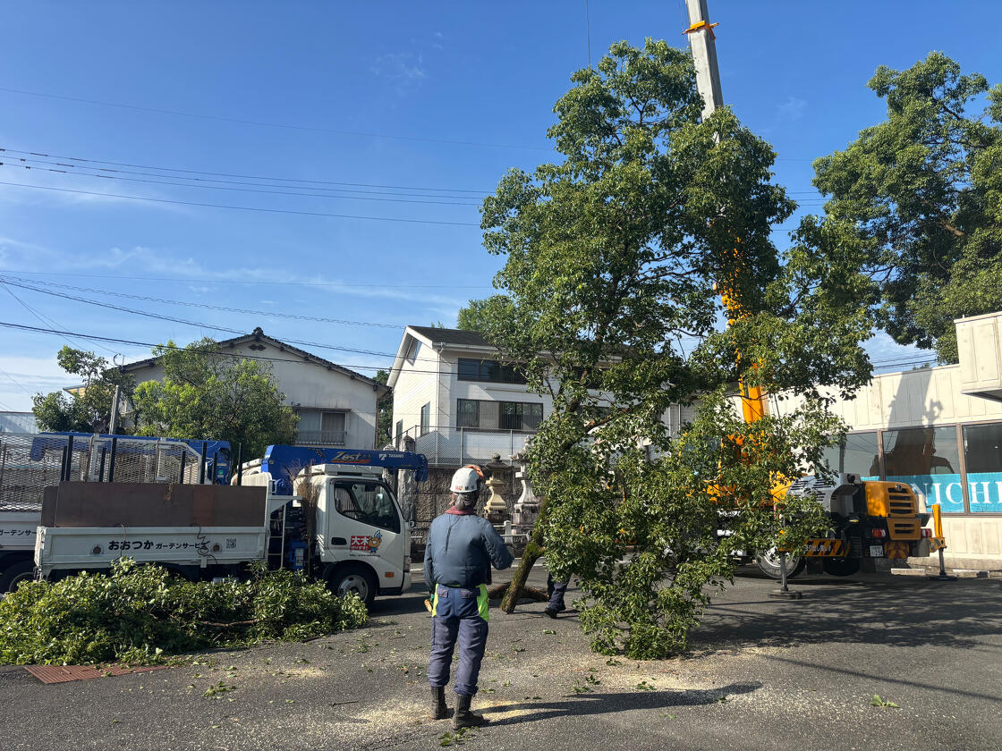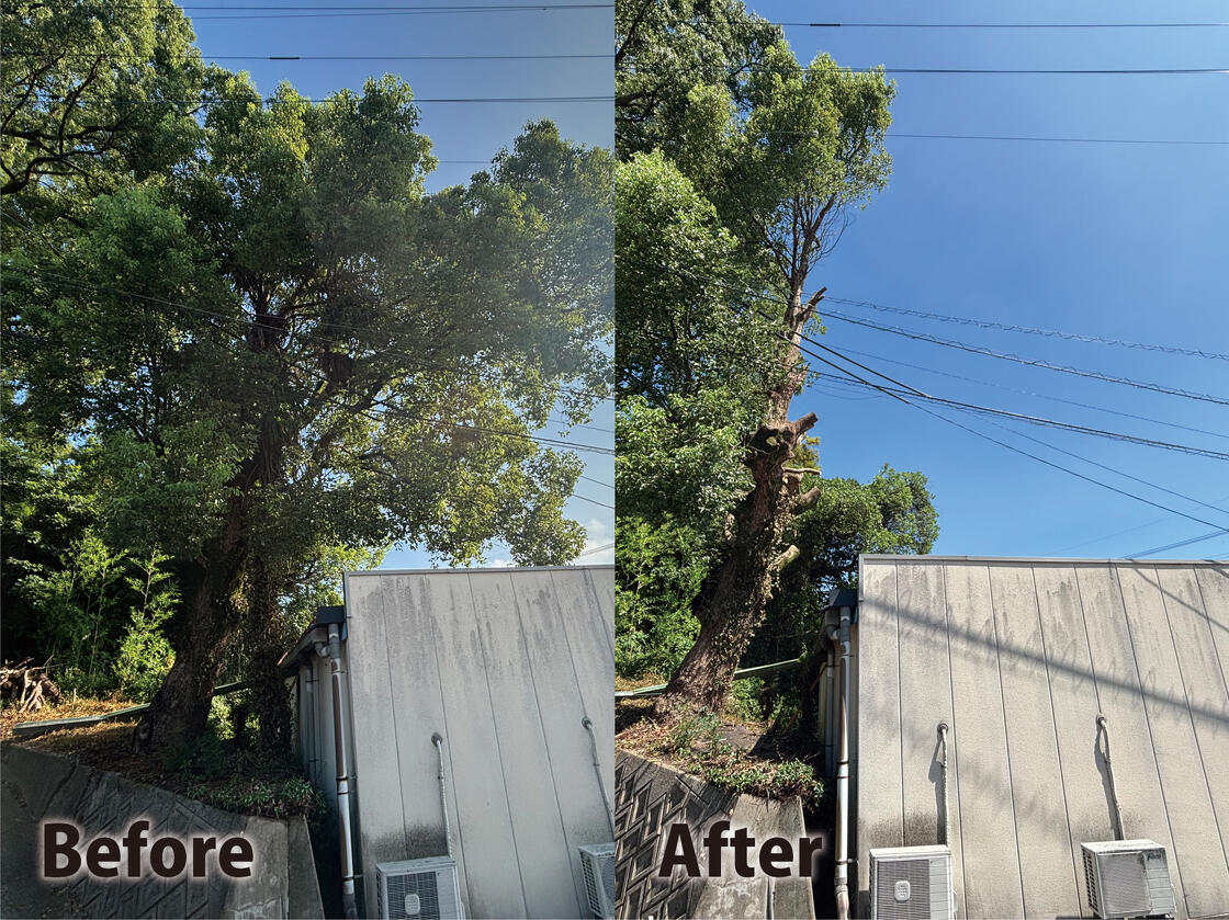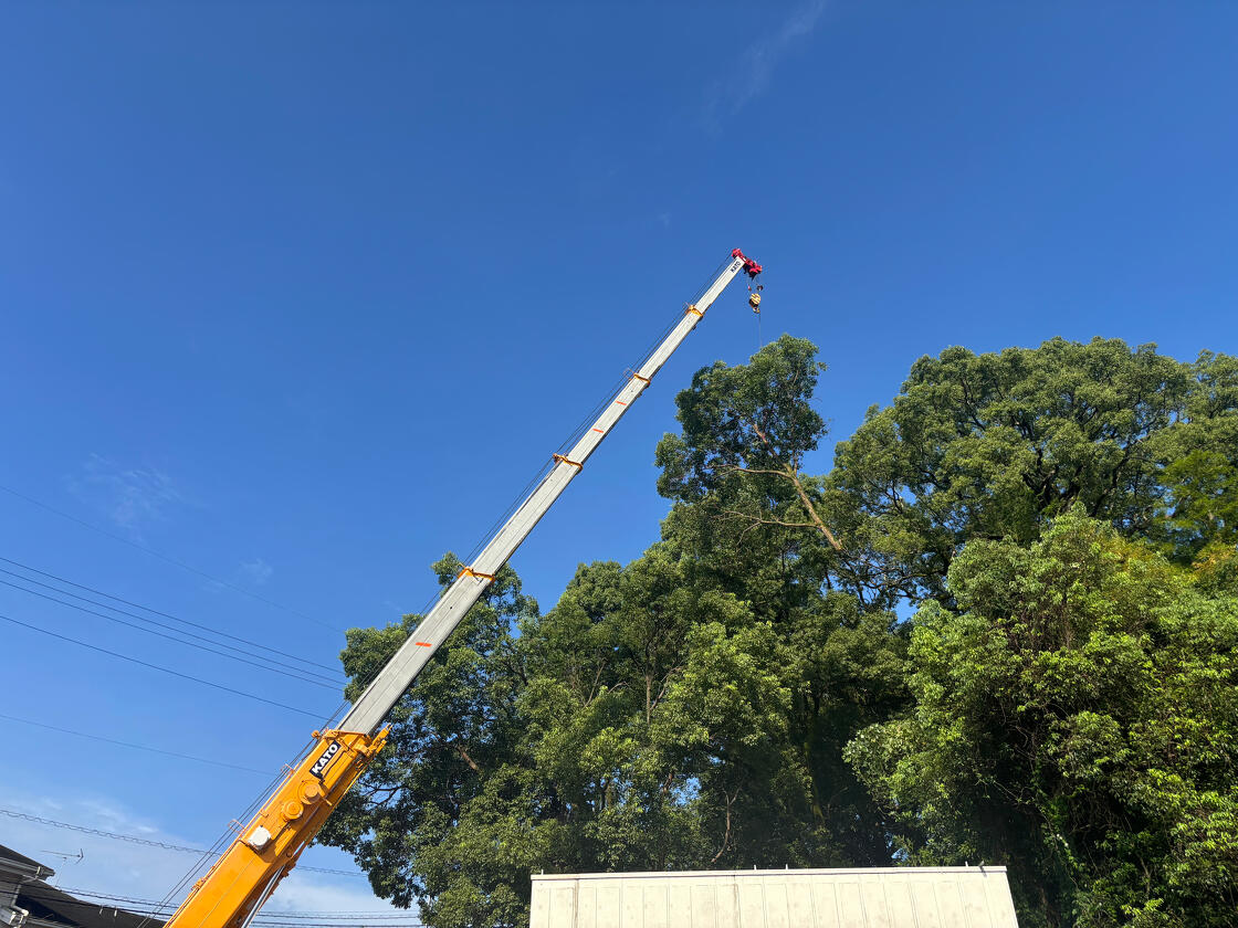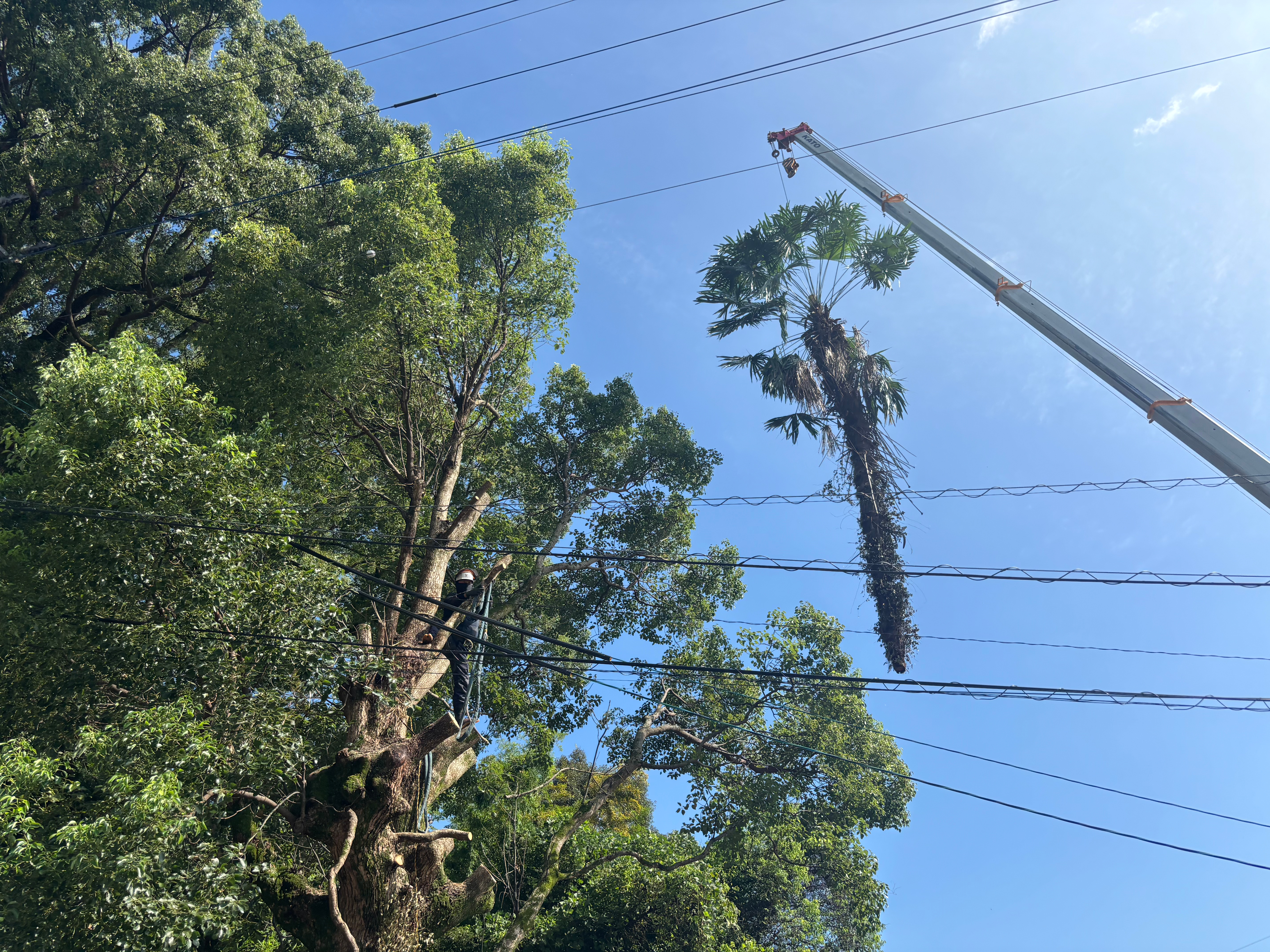 店舗裏の木の伐採 福岡県内 参考料金:200,000円(税別) 伐採 / 搬出・処理 ■店舗裏の木の伐採 ※各画像をクリックで拡大できます。 店舗裏の木が屋根に当たっているとお困りのお客様からのご依頼です。 今回はクレーンを使用して安全に伐採を行っていきます。 店舗の上に被っている枝を全て伐採していきます。 シュロの木は根元から切ります。 伐採した木はワイヤーを下に敷き、適切なサイズに小切りを行い荷造りをしてトラックに載せます。 トラックに荷造りした木を載せ搬出して作業完了です。