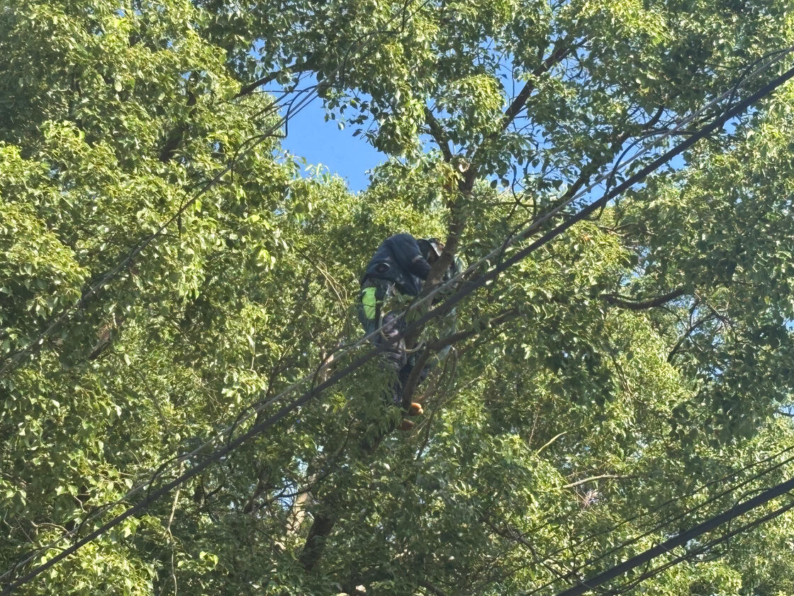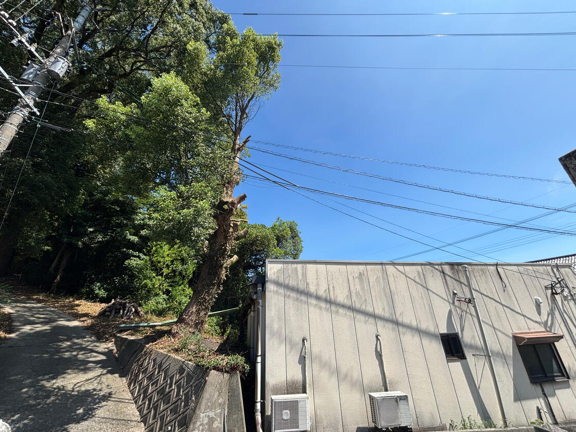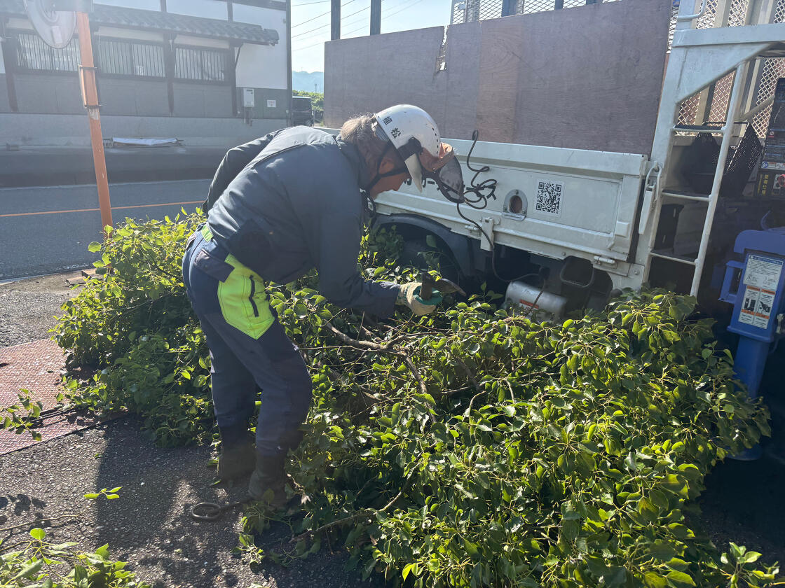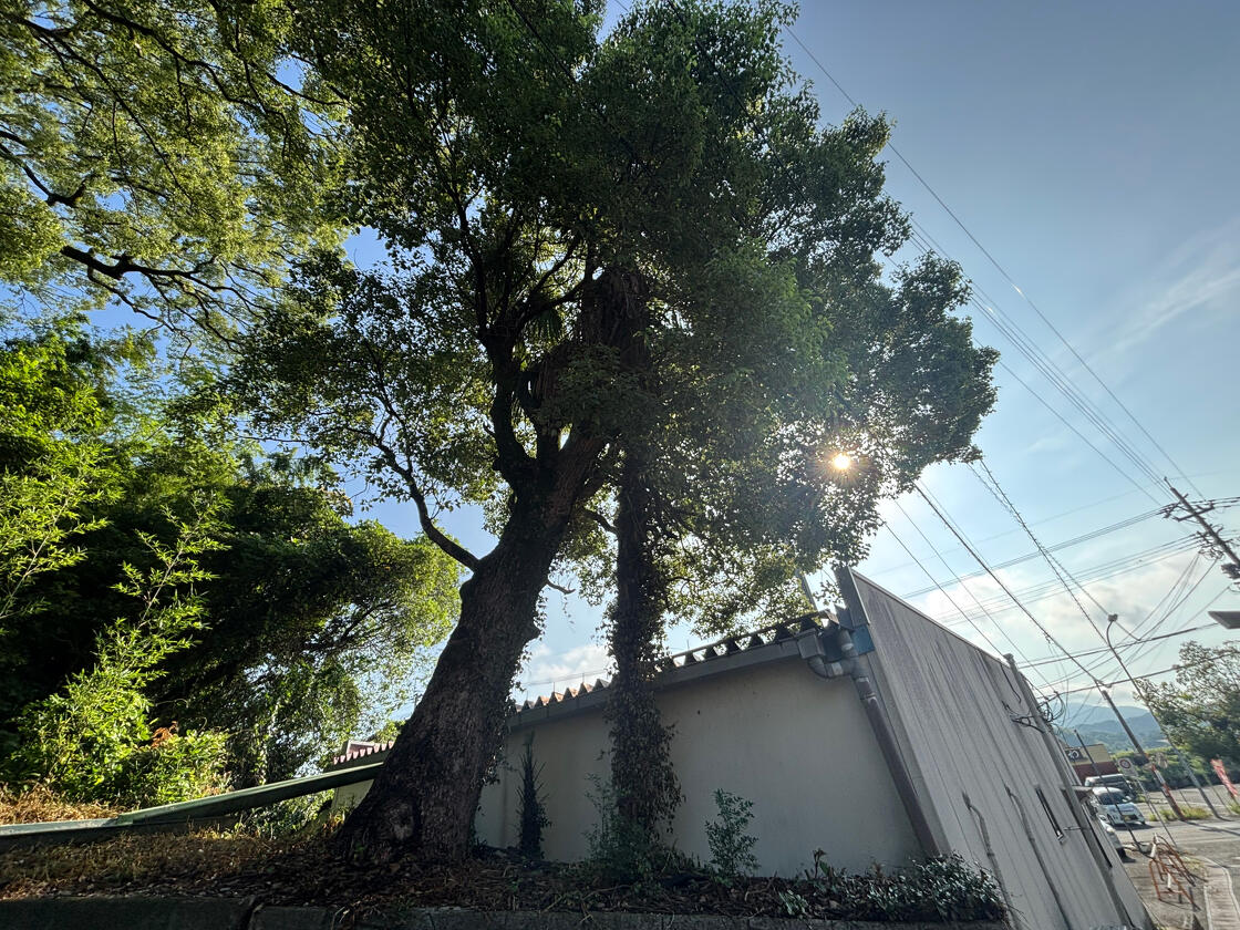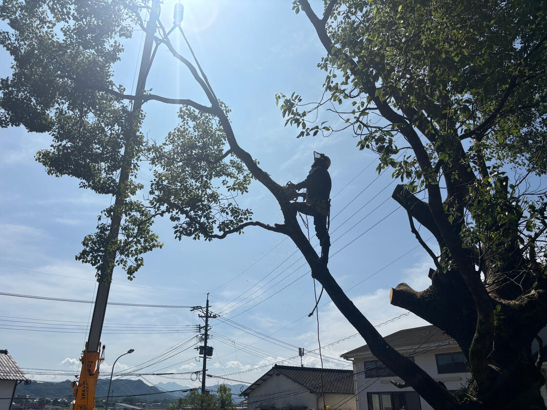 店舗裏の木の伐採 福岡県内 参考料金:200,000円(税別) 伐採 / 搬出・処理 ■店舗裏の木の伐採 ※各画像をクリックで拡大できます。 店舗裏の木が屋根に当たっているとお困りのお客様からのご依頼です。 今回はクレーンを使用して安全に伐採を行っていきます。 店舗の上に被っている枝を全て伐採していきます。 シュロの木は根元から切ります。 伐採した木はワイヤーを下に敷き、適切なサイズに小切りを行い荷造りをしてトラックに載せます。 トラックに荷造りした木を載せ搬出して作業完了です。