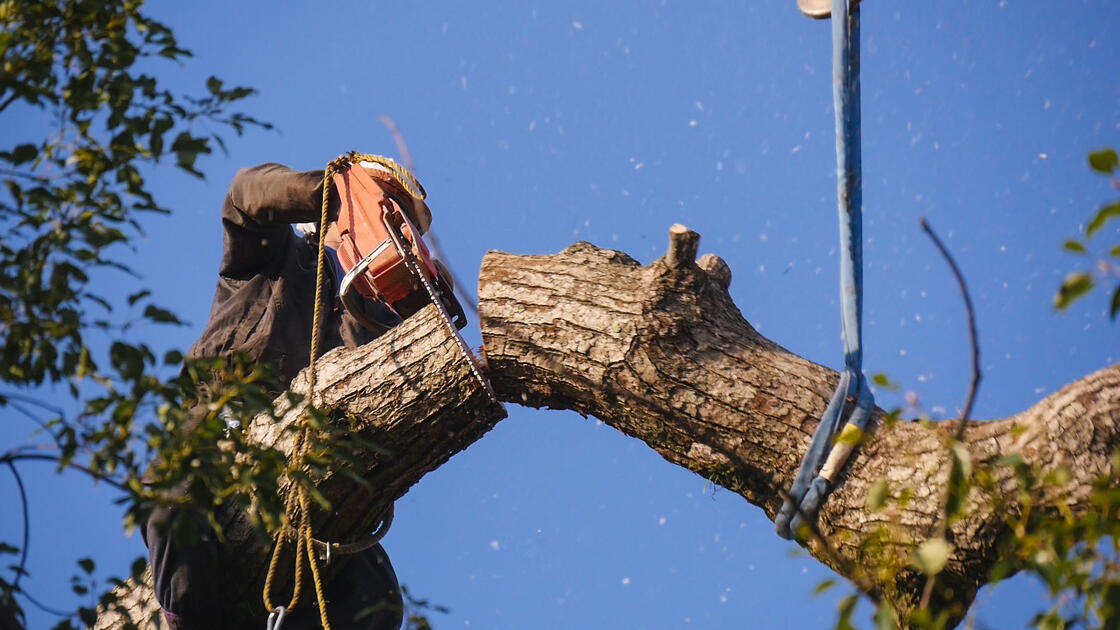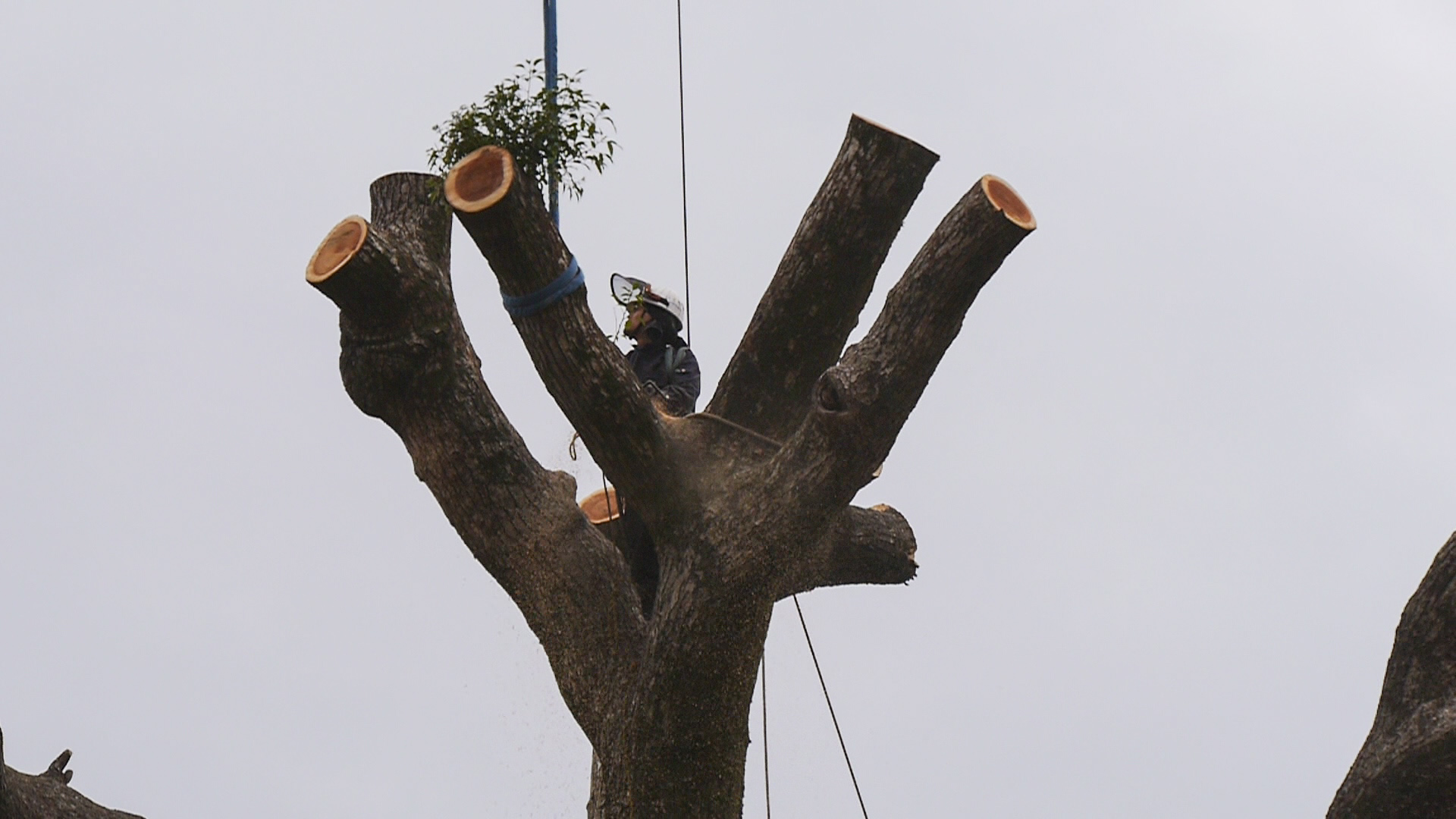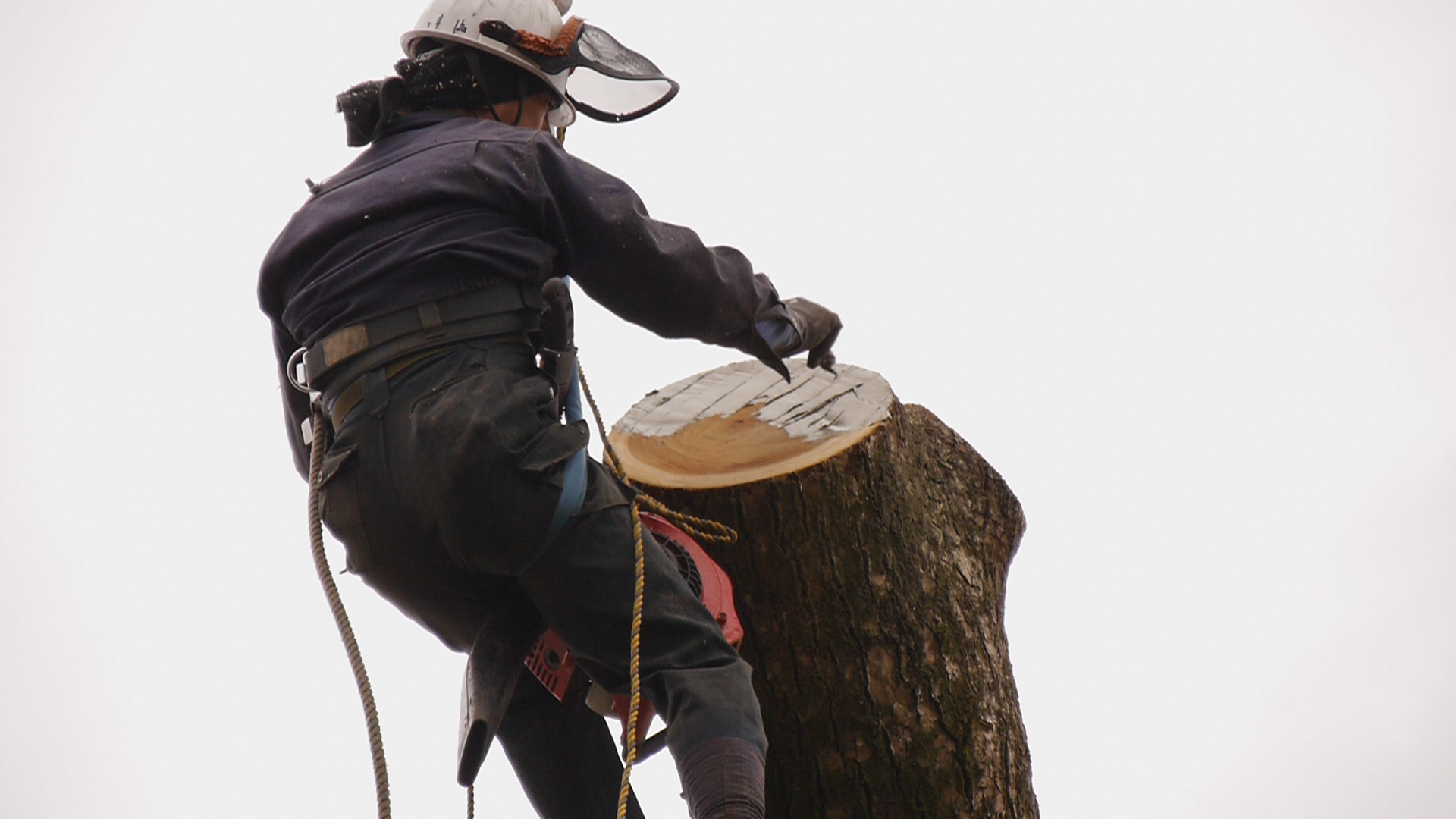 切った枝や幹はクレーンで安全な場所に降ろしていきます。
