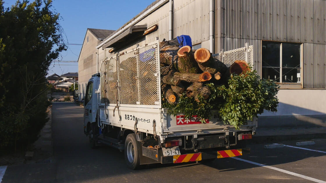 切った木はトラックへ乗せ搬出します。
