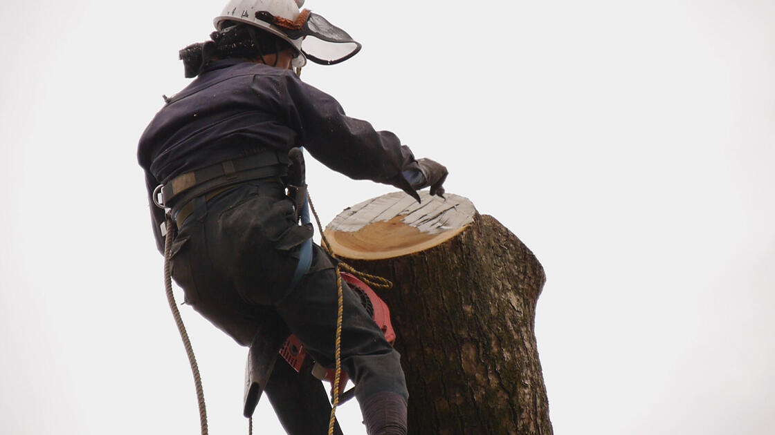 クレーンを2台使用し枝切りを行っていきます。