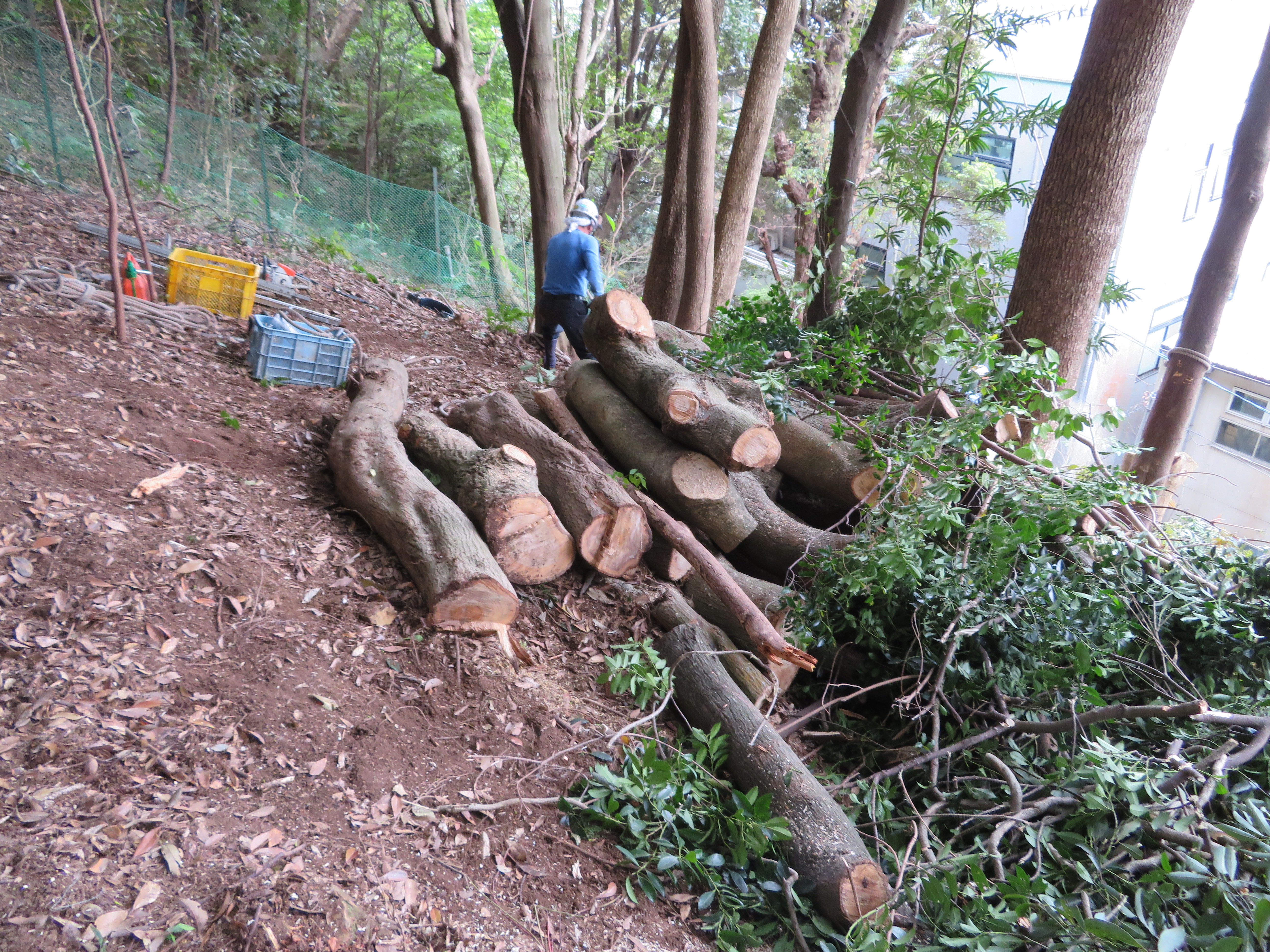 今回はお客様のご希望で搬出処理は行わず、現場の安全な場所に小切り・集積しました。